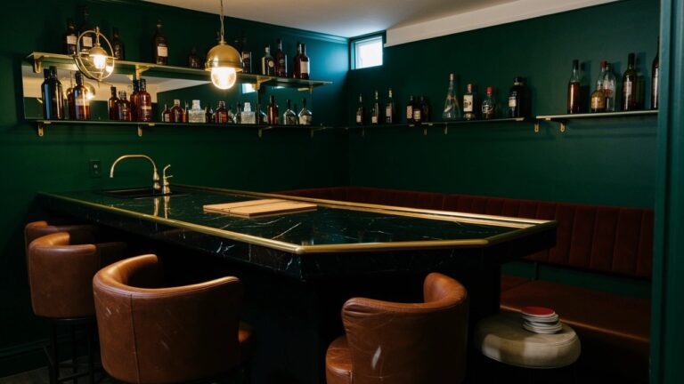 A green tiled bar nook makes a small spot feel like a real speakeasy hideaway. Those emerald tiles bring a touch of luxury to what might just be an empty corner. People like it because it’s bold but cozy, and it doesn’t need a big area to work.